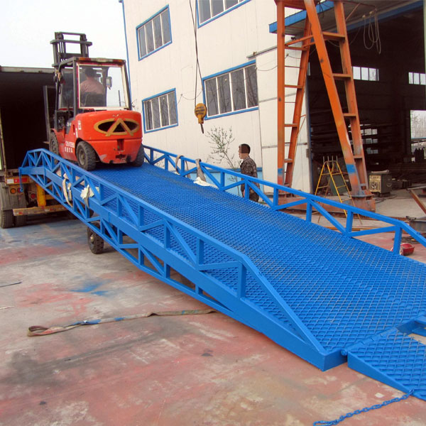 移動式(登車橋,液壓登車橋)是與叉車配合使用的貨物裝卸專用輔助設備。有了它,叉車能直接從地面駛入汽車車 廂內部進行批量裝缷作業。產品采用人工液壓動力,不需接動力電源。只需單人操作,即可實現貨物的安全快速裝卸。它可使您減少大量勞力,成倍提高裝卸作業效率,加快物料流通速度,獲取更大經濟效益。